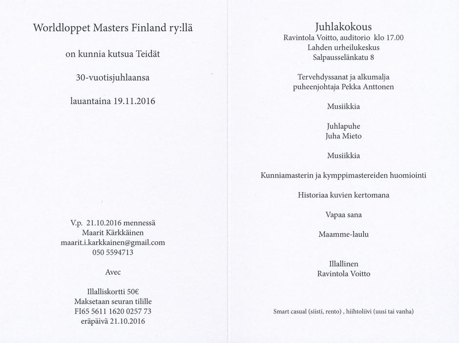 Varaukset tunnuksella ”Finland Mastersien 30 v. juhla” 31.10. .2016 mennessä.