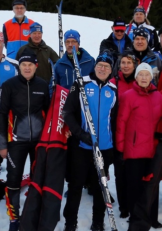 ![]() Hallituksen jäsen J.P. Roos Lahden MM-laduilla kuntotapahtumassa. (Kuva Teuvo Valve) | ![]() Kuntotapahtuman ryhmäkuvasta poimittuna eturivissä Risto Laurila (vas) Mastersuksi-idean isä ja kuntotapahtuman järjestäjä. Takarivissä oikealla toinen kuntotapahtuman järjestäjistä Risto Kemiläinen. (Kuva Teuvo Valve) |