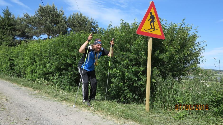Risto Kemiläinen kotimaisemissa kesäharjoittelussa, liikennemerkkikin varoittaan, että täällä harjoittelee hiihtäjä, jolla on eniten suomalaisista Master-arvoja. Peltosen suksillakin on hämmästyttävän hyvä pito heinikossa näin kesäaikaan, kertoo Risto. (Kuva Juha Toivonen)