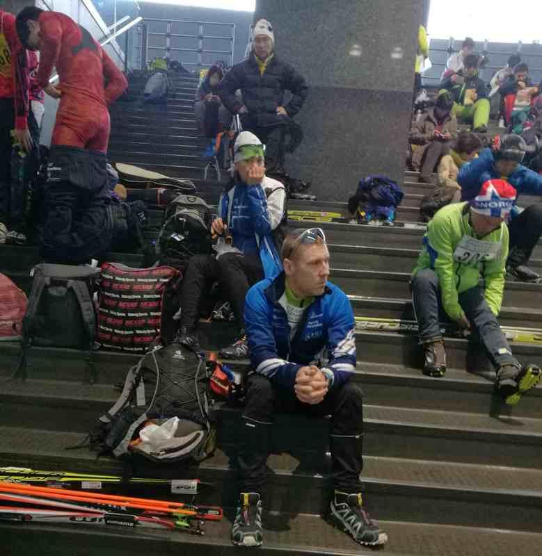 Arja säilyi sunnuntain kisaan asti terveenä, joten reissun tärkein tavoite, Arjan ”masterointi”, oli lähellä. Lähdimme seitsemältä kaikkine kamppeinemme vuokraisännän pikkubussilla kohti Domea. Taksien jättöalueelle pääseminen vaati kuskilta neuvottelutaitoja, mutta lopulta ”Team Finlandille” annettiin lupa ajaa kisakeskuksen ovelle. Domessa on erittäin hyvät ja laajat tilat tällaisen tapahtuman järjestämiseksi. Matkalaukut ja suksipussit sai jättää vartioituun säilöön, sisävessoja ja -pukeutumistiloja on riittävästi. Aurinkovoiteen puuttuessa puolipilvinen pikkupakkanen sopi hiihtokeliksi hyvin. Lähdössä kansainväliset vieraat pääsevät eturiviin. Lähtöalue on suhteellisen kapea, mutta pääosan hiihtäjistä ollessa paikallisia, siis kohteliasta kansaa, se sujui hyvässä järjestyksessä. Kun matkan varrella annoin tietä kakkosaallossa lähteneille miehille, jokainen kiitti ääneen.