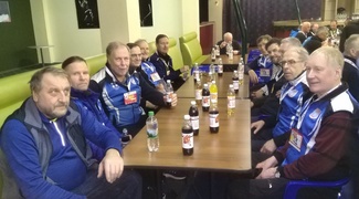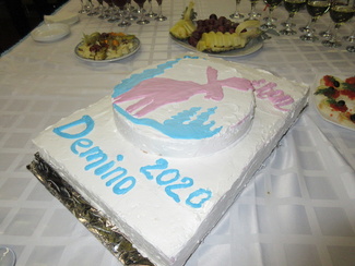 Syötyämme ja juotuamme kahvin kuului kummia. Tapahtuman johtaja pyysi kaikkia paikalla olleita Mastereita siirtymään salin takana olevan verhon taakse, kertomatta mistä on kyse. No, kun Masterit sitten yksi kerrallaan siirtyivät verhon taakse, niin tokihan syykin selvisi. Edessämme oli iso pöytä ja sillä todella iso täytekakku, monenlaista pientä purtavaa ja palan painikkeeksi sekä punaista ja valkoista viiniä, kullekin mieltymyksensä mukaan. Lasit käteen saatuamme kohotimme kaikki maljan Mastereille ja Deminon hiihdoille.