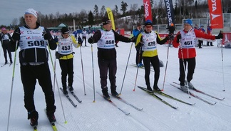 ![]() 25 km lähdössä Kari Kilpinen (vas), Timo Suvanto, joka oli luultavasti vanhin päämatkoja hiihtänyt hiihtäjä, Veli Rautiainen, Jouni Viitamäki ja Pekka Alakuijala.(Kuva Juha Toivonen) |