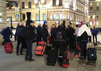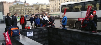 ![]() Tässä ryhmämme matkalla suksiensa kanssa Pietarissa Moskovskiy-asemalle. (Kuva Juha Toivonen) |
