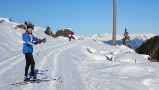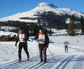 ![]() Teuvo Valve on malttanut jäädä poseeraamaan ylämäessä, joka nousee lähes 2000 metrin korkeuteen. Viereisessä kuvassa Suomen tähän mennessä ainoat Kymppimasterit Risto Kemiläinen (vas) ja Veli Rautiainen kirittävät toisiaan aurinkoisella ladulla. | ![]() |