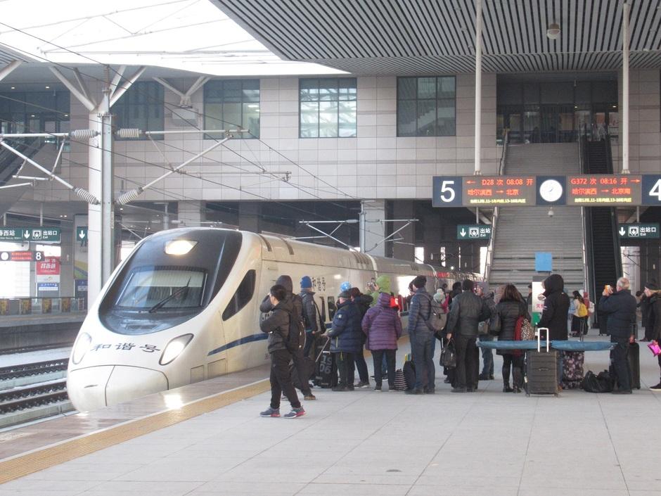 Matka luotijunalla kohti Pekingiä. Matka taittuu mukavasti n. 270km /Hrs ja Beijing (suom. pohjoinen kaupunki) asema ilmestyy näkyviin muutaman tunnin kuluttua. (Huom. lentäen ko. väli taittui 2 tunnissa) Ravintolavaunu taisi tehdä parhaan myyntinsä ja Budveiser olut taisi mennä loppuun.