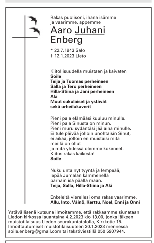 Juhani Enberg siunattiin haudan lepoon Liedossa 04.02.2023. Runsaan saattoväen joukossa oli myös Juhanin kuntoiluystäviä. Juhani oli koko ikänsä harrastanut urheilua ja hän kirjoitti Masterien kotisivuille pyöräretkestään 14-vuotiaana Liedosta Kivijärvelle. Juoksu, suunnistus ja hiihto olivat Juhanin lajeja.