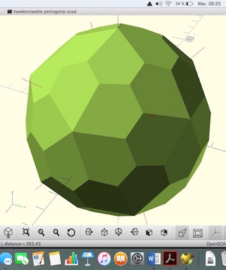 Vieressä FreeScad kuva yhdestä hämmästyttävästä monitahokkaasta. Se on Arkimedeksen monitahokkaan "snub cube" duaali. Se muodostuu 60:stä identtisestä viisikulmiosta, joilla on symmetria-akseli, kaksi samanpituista pitkää sivua ja kolme lyhyempää samanpituista sivua. Se voidaan valmistaa kahdesta osasta, jotka esittävät pohjoista ja eteläistä pallonpuoliskoa.