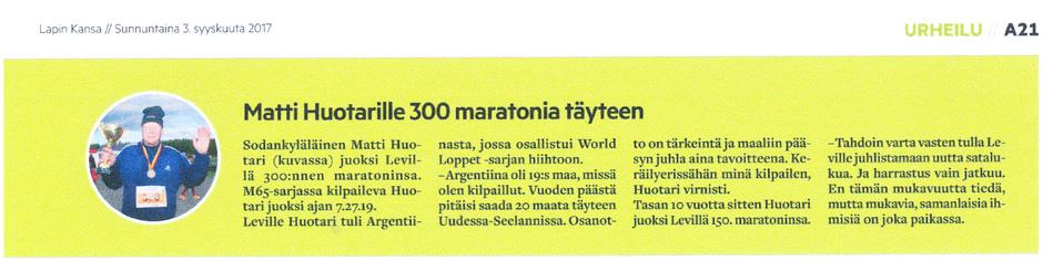 Kaksinkertaiselle Masterille Matti Huotarille Sodankylästä 300 maratonia täyteen Levillä 3.9.2017 !
