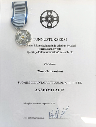 ![]() WORLDLOPPET SKIERS FINLAND RY onnittelee yhteistyökumppanimme Finlandia-hiihdon pääsihteeriä Tiina Hernesniemeä ANSIOMITALISTA joka on myönnetty hänelle tunnustukseksi, kuten kunniakirjassa sanotaan. "Suomen liikuntakulttuurin ja urheilun hyväksi tekemästänne työstä" | ![]() |