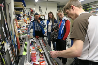 ![]() Tässä Masterit seuraavat tarkasti mitä huoltospesialisti Teemu Haavisto näyttää suksien huoltotoimenpiteistä. Kuvassa Martti Alakuijala (vas), Leena Peltonen ja Pekka Hynninen. |
