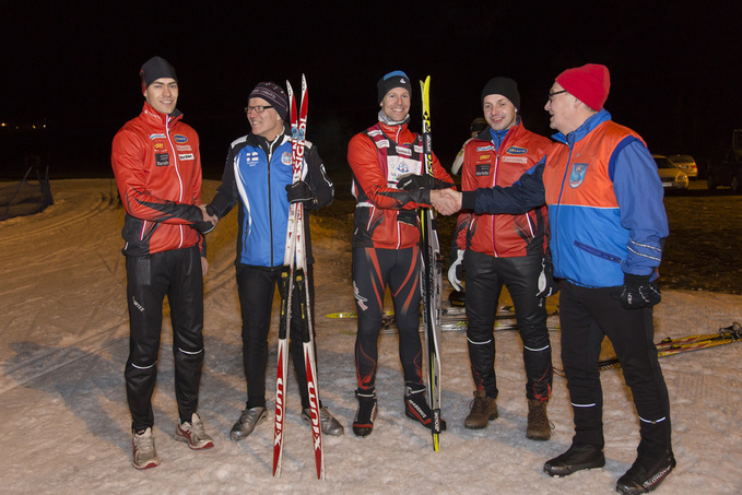 ![]() Vihti Ski Centerin hienoilla laduilla keskiviikkona (17.12. 2014) harjoitusten lomassa puheenjohtajamme Pekka Anttonen kannustaa Vihdin Viestin hiihtäjää Jukka Paloa (vas.). Kannustuskädenlyönnin hiihtäjä Mikko Sakala saa puolestaan Juha Toivoselta (oik.) ja välissä tapahtumaa seuraa Viestin hiihtojaoston vetäjä Petri Teittinen. (kuva Teuvo Valve) |