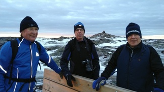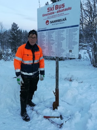![]() Yllä olevassa kuvassa patikkaretkellä melkein lumettoman Kiilopään huipulla ke 21.11. Touko Tuominen (vas), Teuvo Valve ja JP Roos. Tällä reissulla tapasimme Liisa Peltolan (os. Veijalainen) ja Tuomo Peltolan elokuvapuuhissa. Viereisessä kuvassa Masteri Pekka Alakuijala, joka hiihtämänsä 32 km Kiilopäähiihdon jälkeen jäi työskentelemään ja talkoilemaan Kiilopäälle. Tässä Pekka on juuri pystyttänyt hiihtobussin aikaulun, jolla pääsee laskettelemaan Saariselälle ja Kaunispäälle, Kiilopään päärakennuksen eteen. Toinen Kiilopäällä talkoileva ja työskentelevä Masteri on Hannu Backman, joka huolehti mm. patikoiden tehdyn "Kiilopäähiihdon" suunnittelusta ja toteutuksesta. Hän toimi retken mainioa turkkilaisena kebab-kokkina. (Kuvat Juha Toivonen) | ![]() |