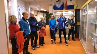 ![]() Suksimuseoon tutustumassa: Kaarina Vanhanen (vas), Matti Vanhanen, Teuvo Valve, Asta Hilska, Marjatta Lehtonen, Touko Tuominen ja JP Roos. (Kuva Juha Toivonen) |