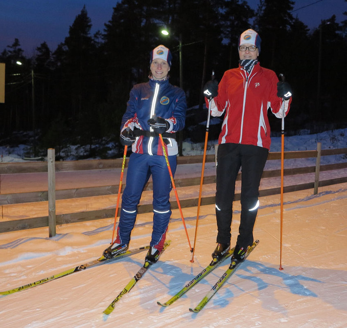![]() Neea Kojola (vas, Finlandiassa no 596) ja Elina Mattila (no 1223) Valpperin hiihtokeskuksen maastossa illan pimetessä helmikuun puolivälissä. (Kuva Juha Toivonen) |