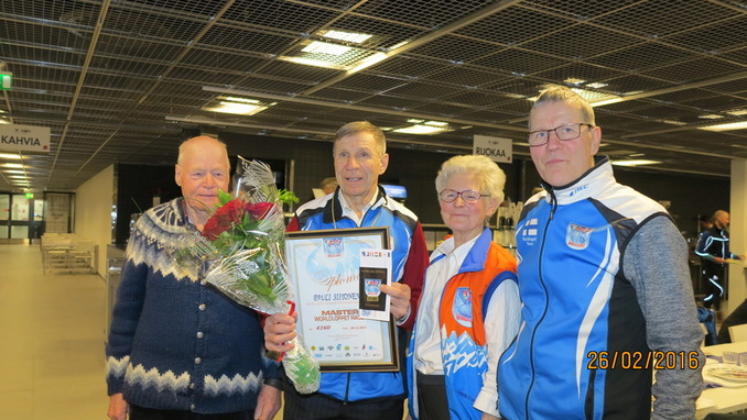 ![]() Worldloppet Master Finlandin puolesta Master-arvoon liittyvän kunniakirjan, käädyt ja leimatun passin luovuttivat Pauli Siitoselle puheenjohtaja Pekka Anttonen (oik), Asta Hilska ja Masterien Grand Old Man Hannes Larsson. (Kuva Juha Toivonen) |