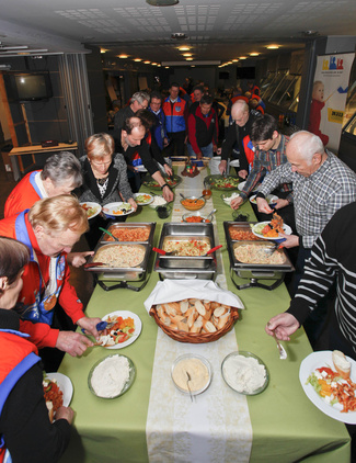 Kauniisti katetusta pöydästä tuntuvat Finlandia-hiihdon pasta- ja muut herkut maistuvan Mastereille. |