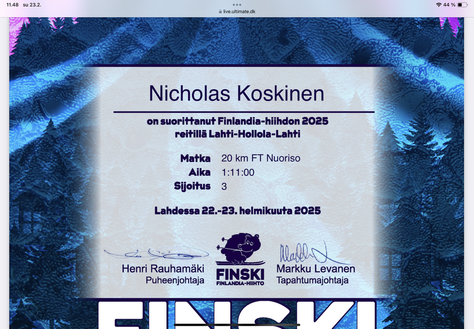 Yhdistyksemme tämän vuotinen kummihiihtäjä Nicholas Koskinen (15 v) menestyi erinomaisesti nuorten hiihtäjinen 20 km vapaalla, vaikka tekikin 2,5 minuutin mittaisen "lisälenkin" vailinaisen reittimerkin takia.