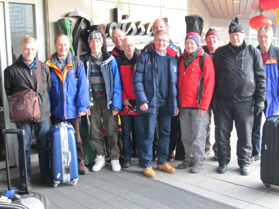Osa suomalaisista Kiinan ensimmäiseen WL-hiihtoon 2.1.2015 osallistuneista hiihtäjistä Pekingiläisen hotellinsa Radissonin edustalla. - lisää hiihdosta Uutispalstalla.