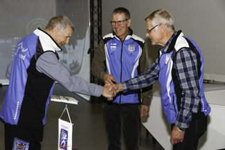 ![]() Hiihtolegenda, Master Pauli Siitoselle Masterien juhlakirjan luovuttivat juuri kättelevä Risto Laurila ja Pekka Anttonen. (Kuva Teuvo Valve) |
