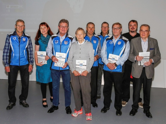 ![]() Numeroitujen kirjojen saajat kirjat sylissään: Varapuheenjohtaja Risto Laurila (vas), Lahden Hiihtomuseon tutkija Suvi Kuisma, Worldloppet Ski Federationin presidentti Juha Viljamaa, mestarihiihtäjä Siiri Rantanen, hiihtolegenda Pauli Siitonen, puheenjohtaja Pekka Anttonen, historiakirjan vastaava tuottaja Juha Toivonen, Finlandia-hiihdon edustaja Sami Kulmala ja historiaprojektin asiantuntija Pentti Kurunmäki. (Kuva Teuvo Valve) |