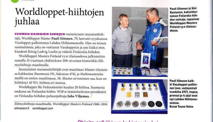 - Suomen Masterien 300-sivuinen historia "ELÄMYSHIIHTOJA MAAILMALLA" Worldloppet Masters Finland 1986 - 2016 julkistettiin.