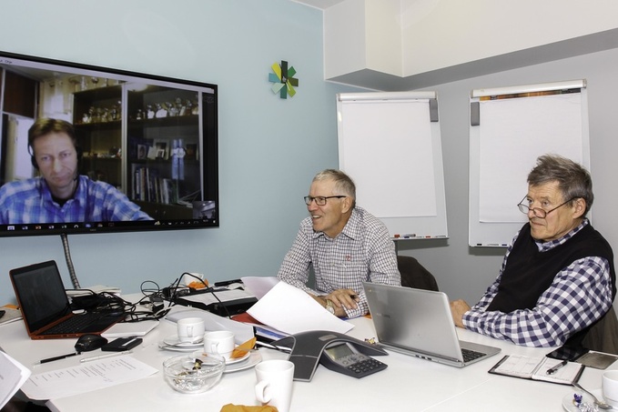 ![]() Koskapa hallituksen jäsenet asuvat eri puolilla Suomea, eikä aina ole mahdollista saapua kokouspaikalle. Käyttää hallitus apunaan nykytekniikkaa. Kuvassa keskellä puheenjohtaja Pekka Anttonen ja Skypen kautta Torniosta sihteerimme Tero Kasala sekä mietteliäänä JP Roos. (Kuva Teuvo Valve) |