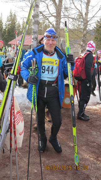 ![]() Pekka Anttonen StaffetVasan maalissa keväällä 2015. Pekka kannustaa keräämään viiden hiihtäjän joukkueen ja lähtemään vuoden 2016 hiihtoon. (Kuva Juha Toivonen) |