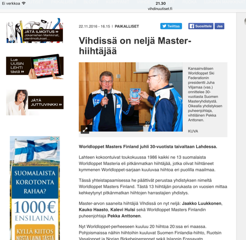 Yllä sivukaappaus VIHDIN UUTISTEN Masterien 30-vuotisjuhlajutusta