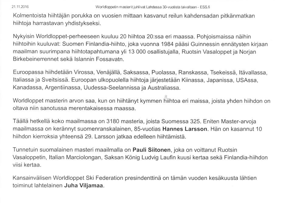 WMF hallitus piti Kiilopäällä kokouksensa. Hallitus oli yhtä jäsentä lukuun ottamatta kokonaisuudessaan paikalla. Hallitus teki historiallisen päätöksen, Worldoppet Master Finland ry hakee International Association of Worldloppet Skiersin ( IAWLS) jäseneksi. Asia on ollut esillä ennenkin. Hannes Larsson on 14.10.2002 kirjeellään lähestynyt WL Masters Finlandia, että se liittyisi kollektiivisesti IAWLS:n jäseneksi. Tuolloin asia jäi silloisessa johtoryhmässä pöydälle. Nyt 25.11.2016 tehtiin päätös hakea jäsenyyttä.