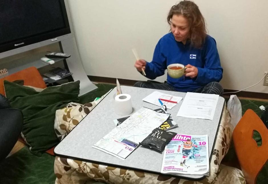 Keski-Euroopan kisoja vaihtelevampi reitti oli kiva ja hiihdosta jäi hyvä mieli. Kisan jälkeen kaikki mahtuivat takaisin Domen lämpöön ja siistiin lämpimään suihkuun. Nyt oli aika sanoa heipat Sapporolle ja kävellä kamppeiden kera lentokenttäbussin pysäkille, joka oli sopivasti Domen kohdalla. Kisanjälkeisen tankkauksen edessä olevaa ”turistina Tokiossa” etappia varten teimme lentokentän ravintolassa (joista ei saanut lihatonta annosta!).