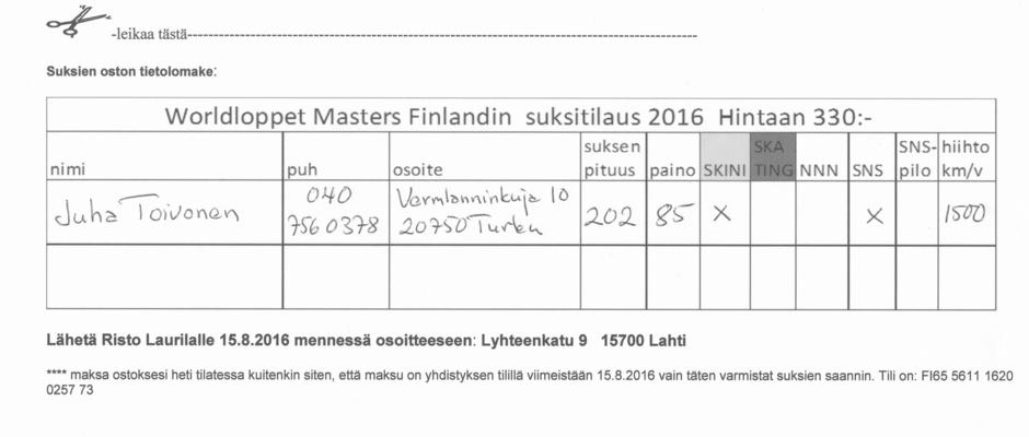 Vaihtoehtoinen tapa ostaa sukset on tulostaa yllä oleva lomake ja sitten täyttää se tai jos tulostus ei onnistu niin lähettämällä vastaavat tiedot vapaamuotosella kirjeellä postitse osoitteeseen: